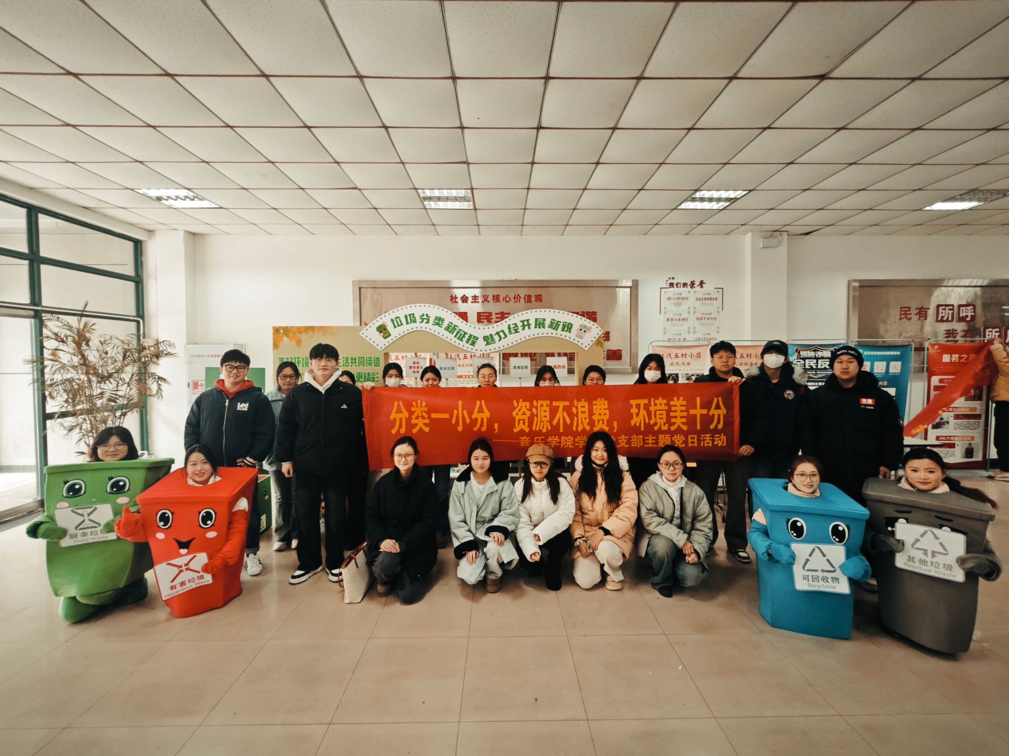 2025年2月22日上午,永利23411集团学生党支部联合合肥市江汽五村小区党群服务中心,组织开展“分类一小分,资源不浪费,环境美十分”主题党日活动。二十余名学生党员深入社区,通过宣传讲解、互动体验、实践指导等形式,助力提升居民垃圾分类意识,推动环保理念落地生根。