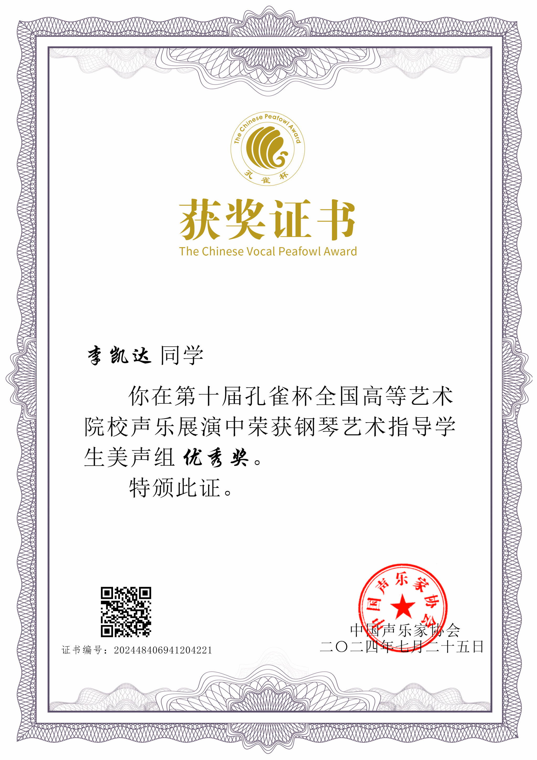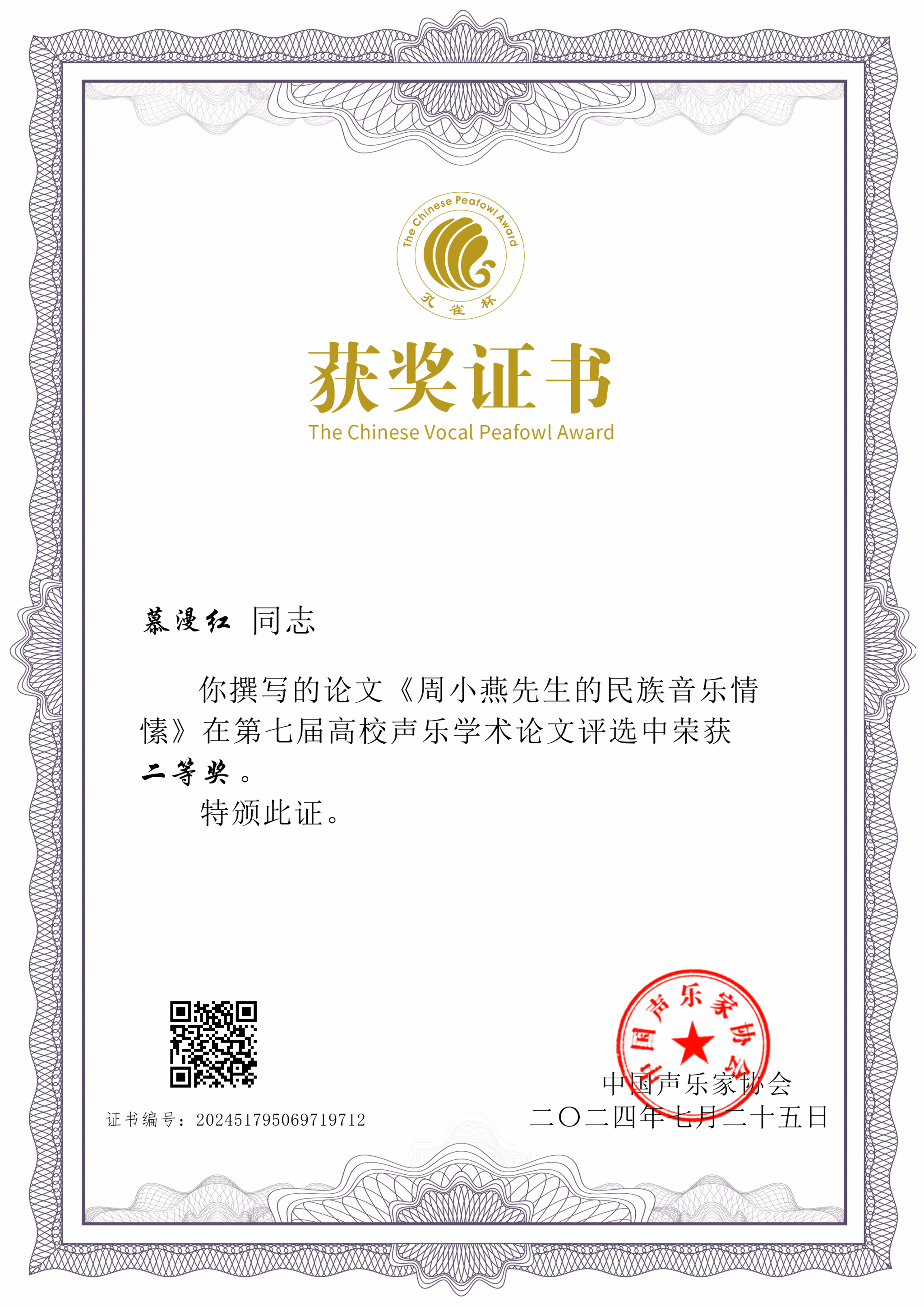 近日,备受关注的“第十届孔雀杯高等艺术院校声乐展演暨第八届高校声乐学术交流活动”日前在广州落下帷幕,我院师生在近4000名展演选手中表现突出,在参加的3个组别展演中均取得不错成绩,其中慕漫红获“高校声乐学术论文”教师组二等奖,李韵涵获“综合师范院校本科生美声组”优秀奖(指导教师谢梦柯、苏丽丽),李凯达获“钢琴艺术指导学生美声组”优秀奖(指导教师叶蕾),永利23411集团获颁优秀组织奖。
