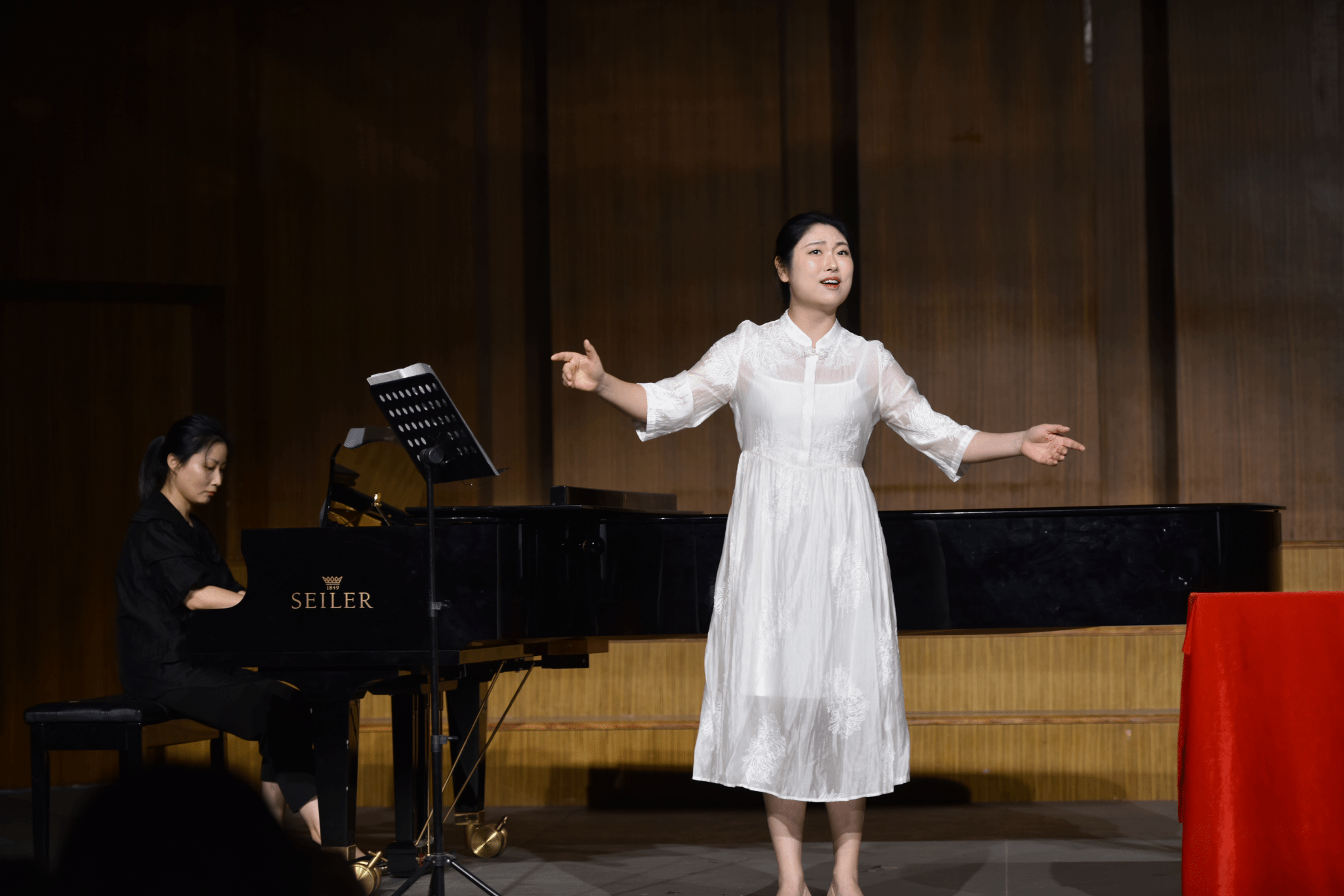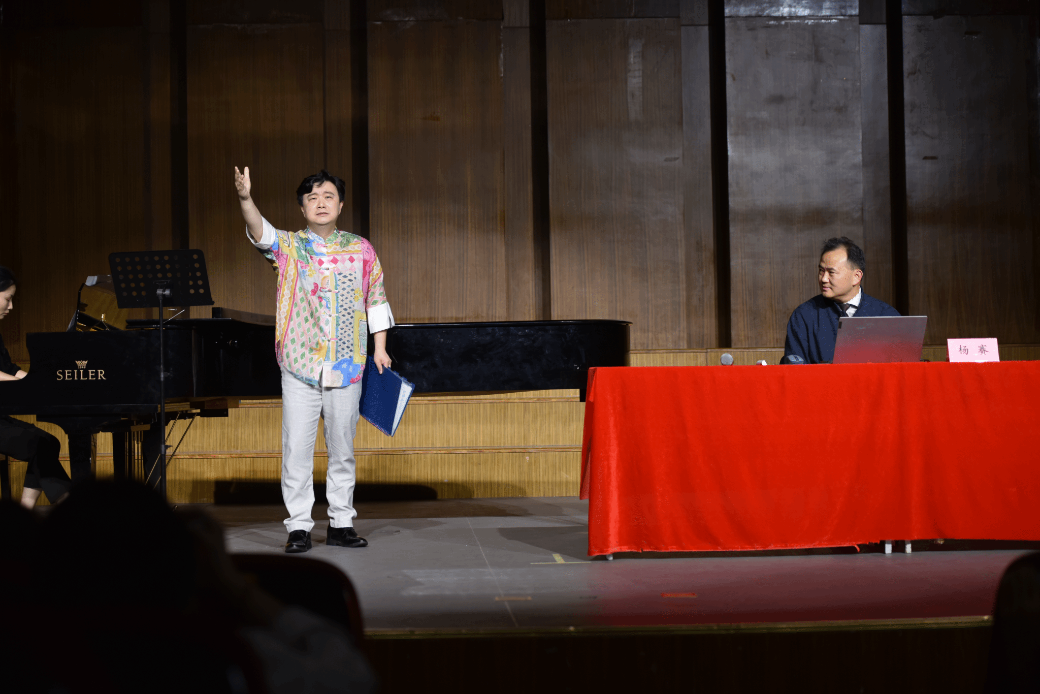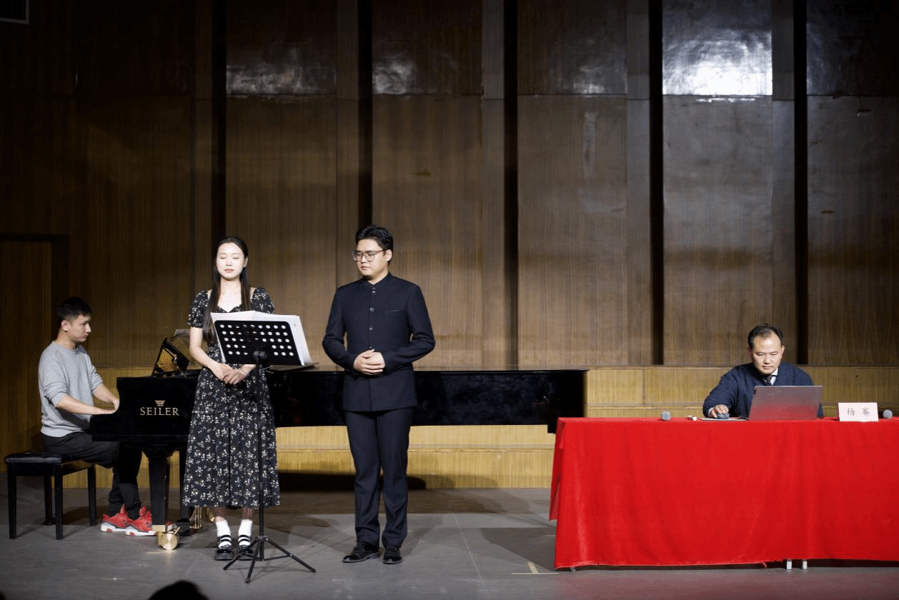 根据朝代顺序,我院李雷和吕岩老师合作演唱了《诗经·采薇》中的《关雎》,独特的旋律与词相结合,令人耳目一新。白佳蕙和吕岩老师合作演唱了汉武帝刘彻的《秋风辞》,将整首诗的空间感、时间感、画面感体现的淋漓尽致。之后又分别展示了汉乐府《长歌行》、唐代诗人张志和《渔歌子》、李煜的《浪淘沙令》、宋朝林逋的《长相思·惜别》。每一首作品伴随着杨赛教授的导聆、范唱和解说,让大家对于中国古代诗词有了新的认识,和着工尺谱的节奏和旋律,台上台下互动气氛十分热烈。