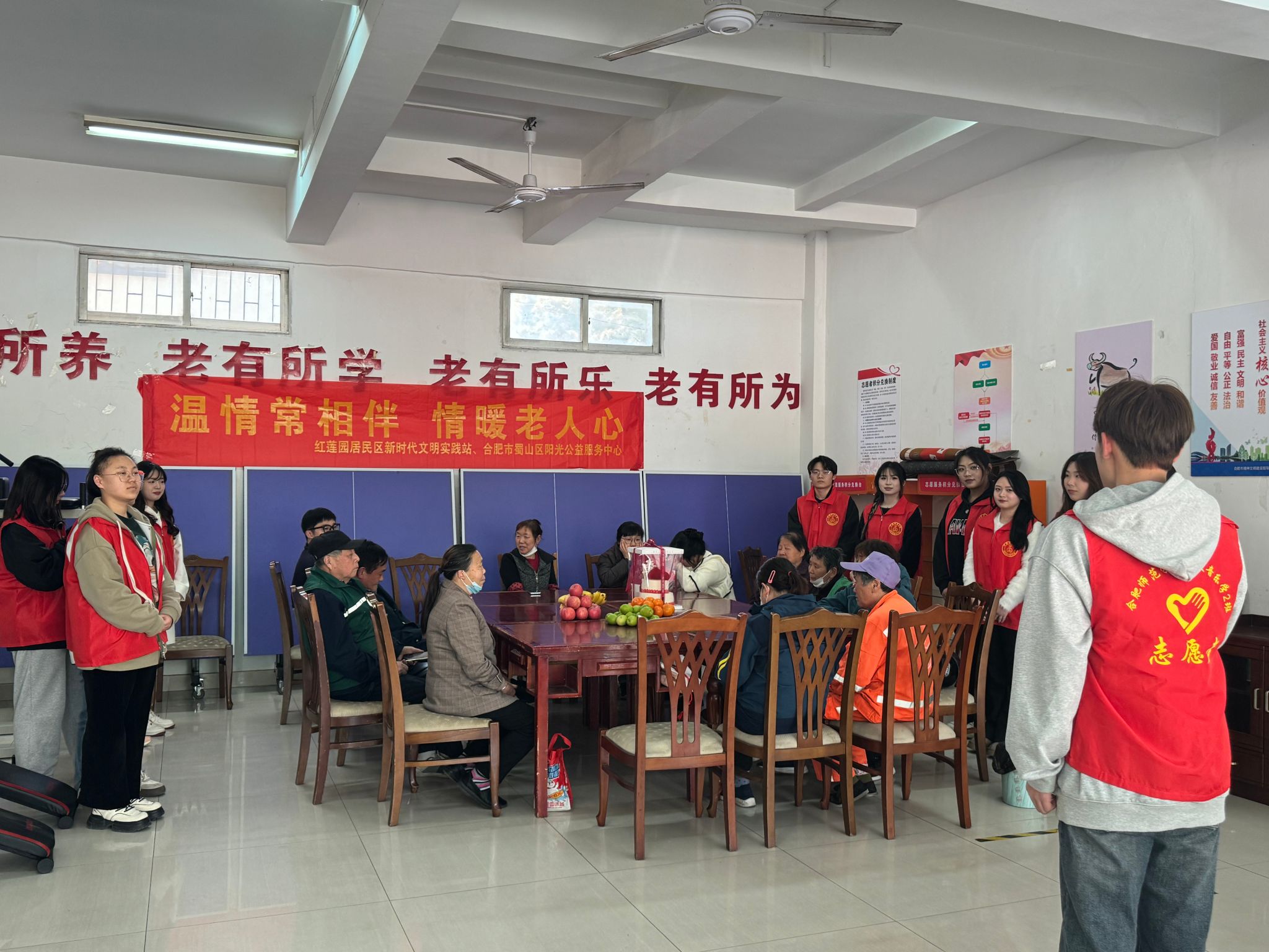 团支部的同学们精心准备了水果和独唱、合唱、舞蹈等才艺节目,给老人们送来了欢乐和祝福。为两位老人准备了生日蛋糕,共同庆祝生日。老人们积极参与,主动配合,现场气氛非常融洽。