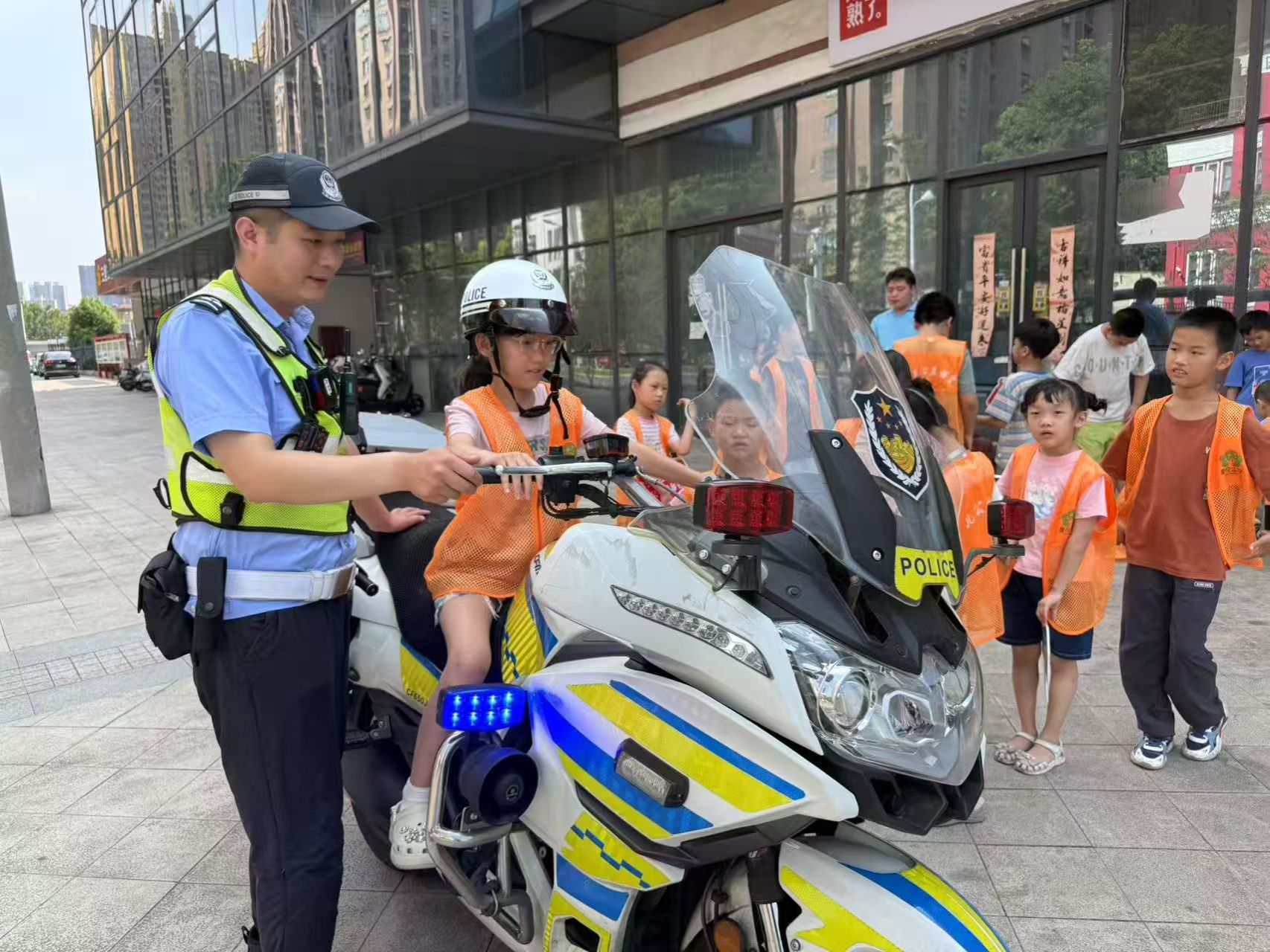 最让孩子们兴奋的莫过于摩托车体验环节。瞿警官先示范了安全头盔的正确佩戴方法,强调“头盔是骑行时的‘保护罩’”,随后邀请孩子们在大学生志愿者陪同下,有序体验佩戴头盔、模拟骑行。“原来头盔这么重要!”刚体验完的小朋友亮亮摸着头盔说,以后骑车一定记得戴。