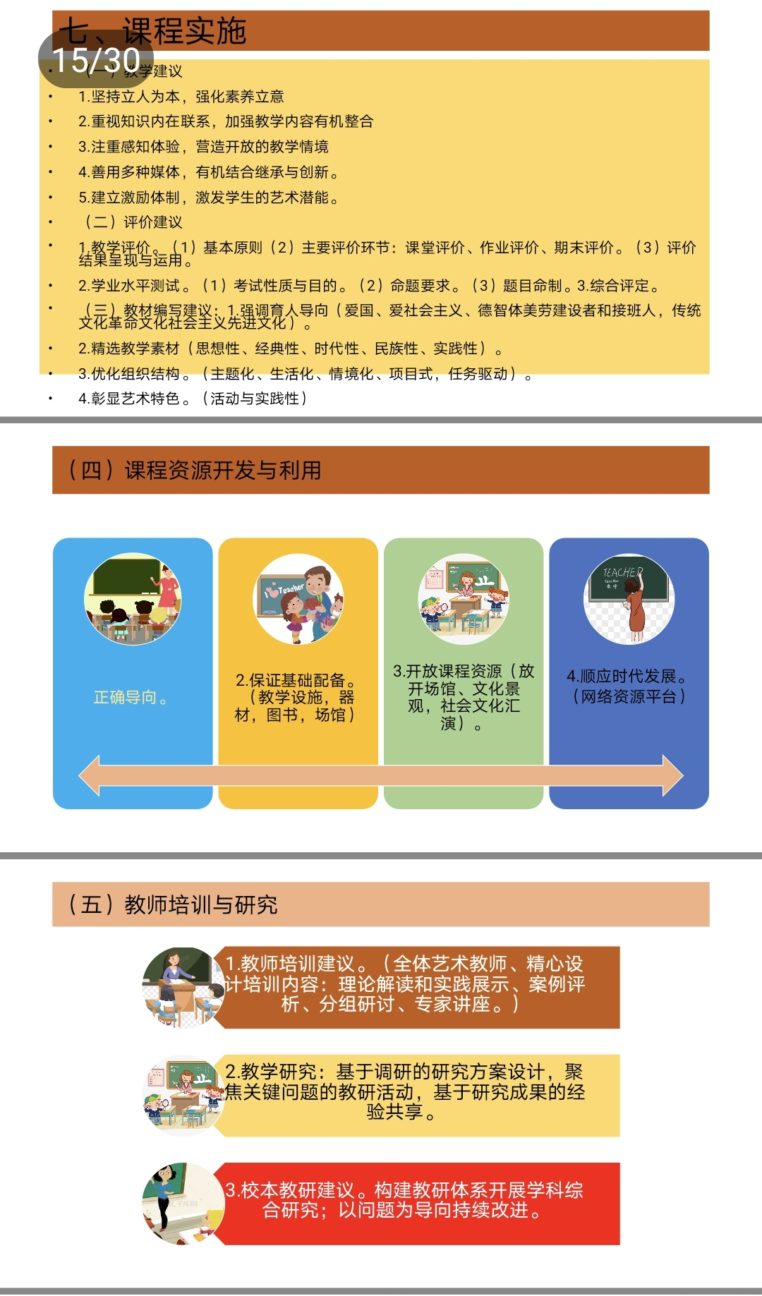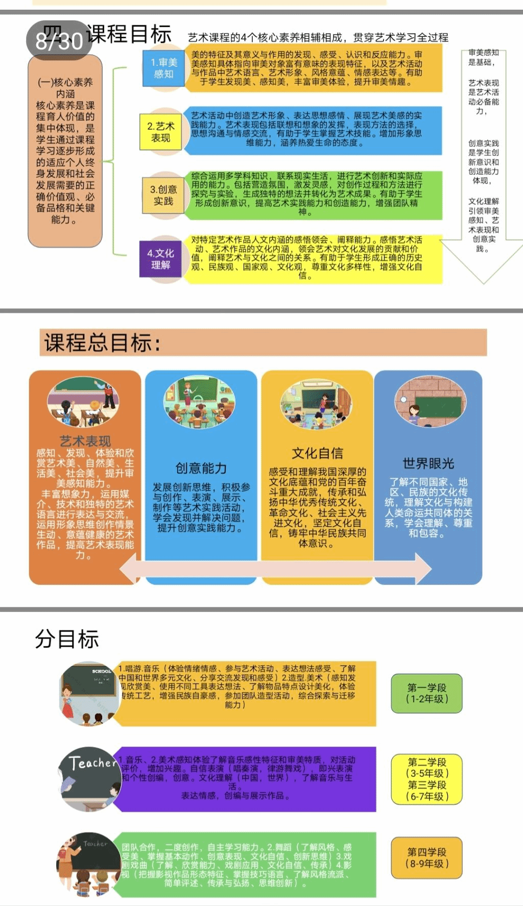 在“课程目标”的讲解中,李院长详细讲解了:四个核心素养,即审美感知、艺术表现、创意实践、文化理解,其中审美感知是基础,艺术表现是艺术活动必备能力, 创意实践是学生创新意识和创造能力体现, 文化理解引领审美感知、艺术表现和创意实践。