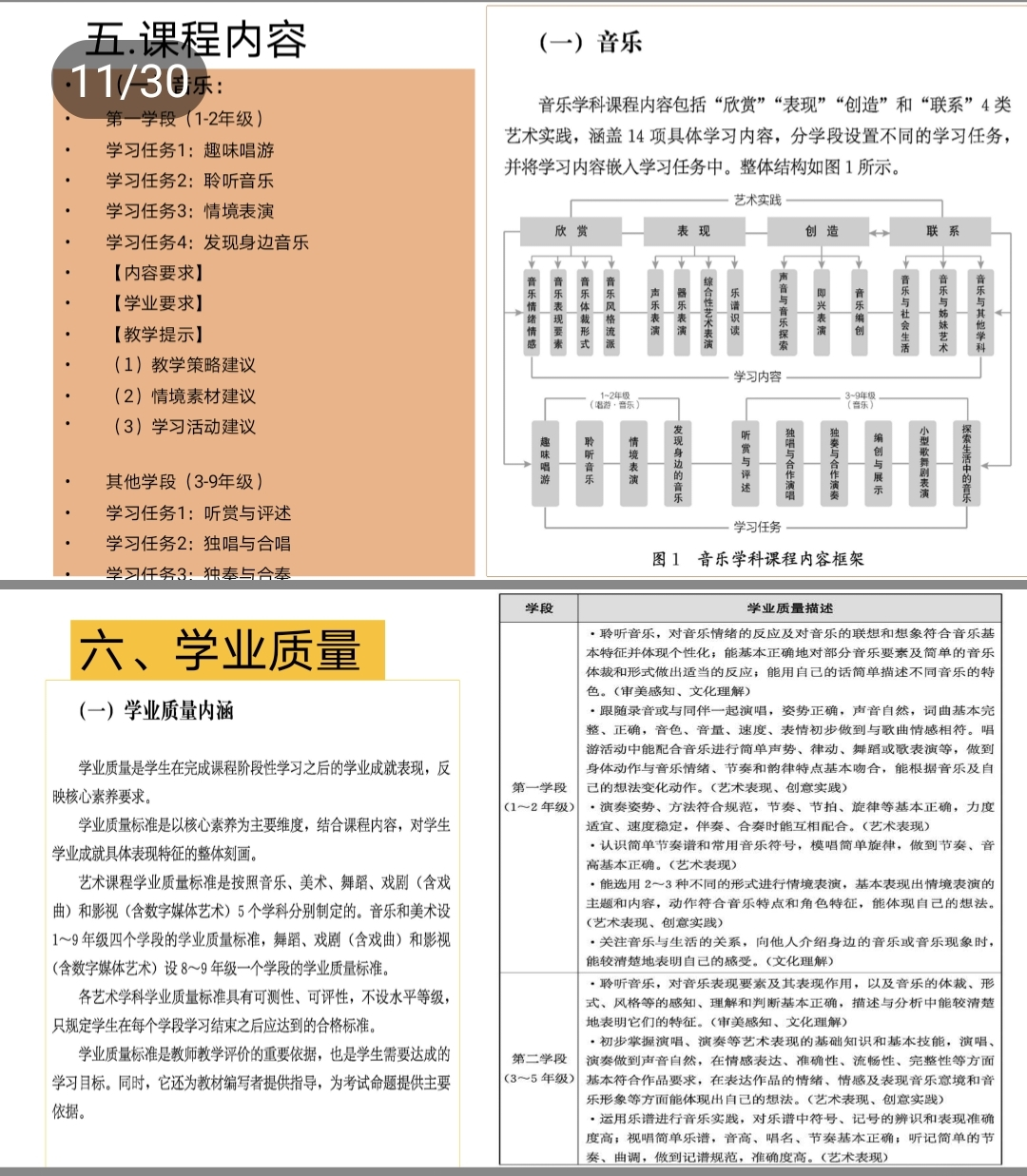 在“课程内容”中,李院长以第一学段(1-2年级)为例,讲解了“趣味唱游、聆听音乐、情境表演、发现身边音乐”等教学内容以及对学业方面的要求。