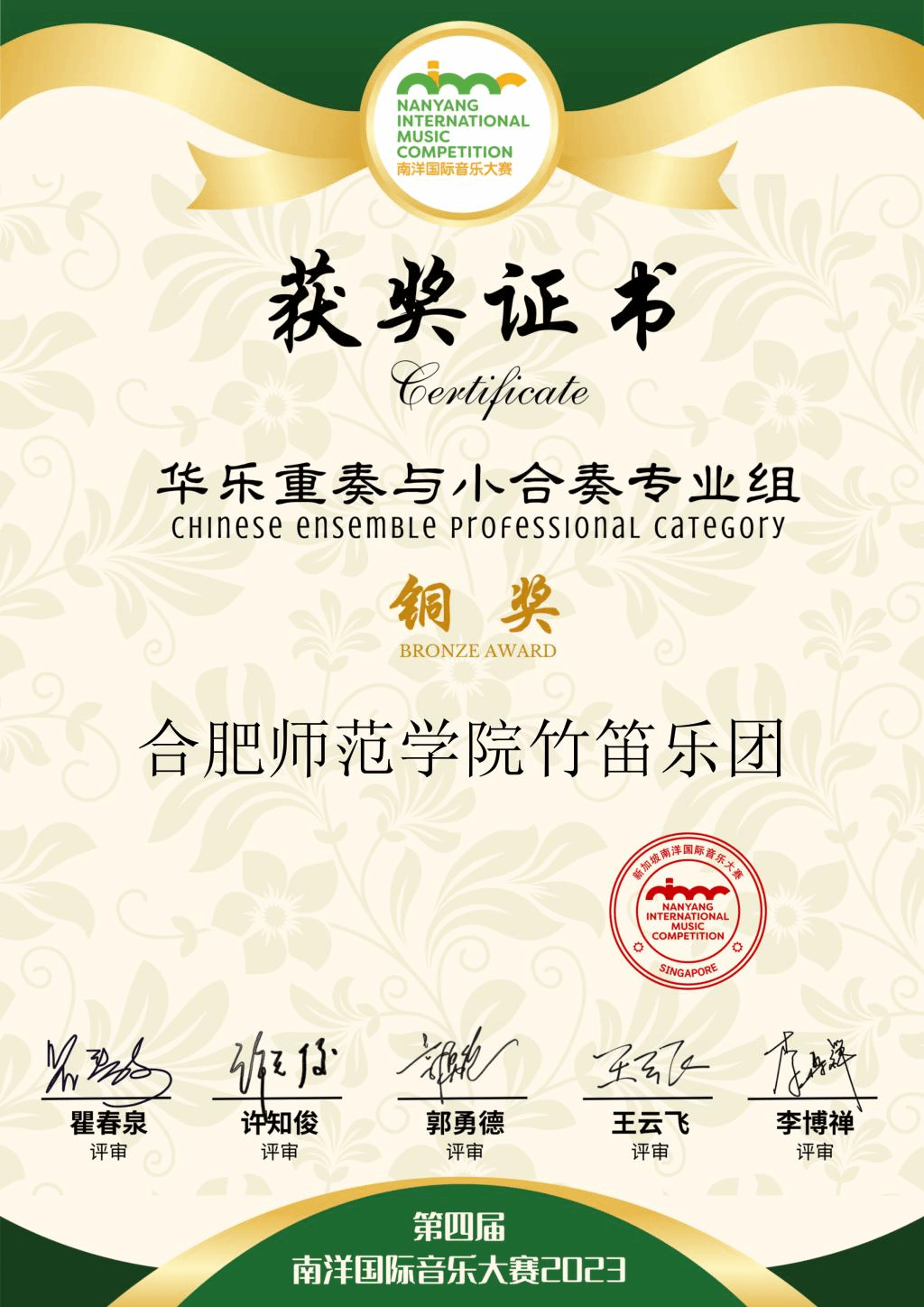 本网讯 由新加坡南洋艺术学院主办的第四届南洋国际音乐大赛(华乐组)于7月25日圆满落幕。永利23411集团2020级4位竹笛主项学生郑伟康、高佳佳、赵晓雨、王子妍,2022级打击乐主项学生侯仰骐组成的“yL23411永利集团竹笛乐团”在马雪老师的指导下参加了华乐重奏与小合奏专业组比赛,斩获铜奖。