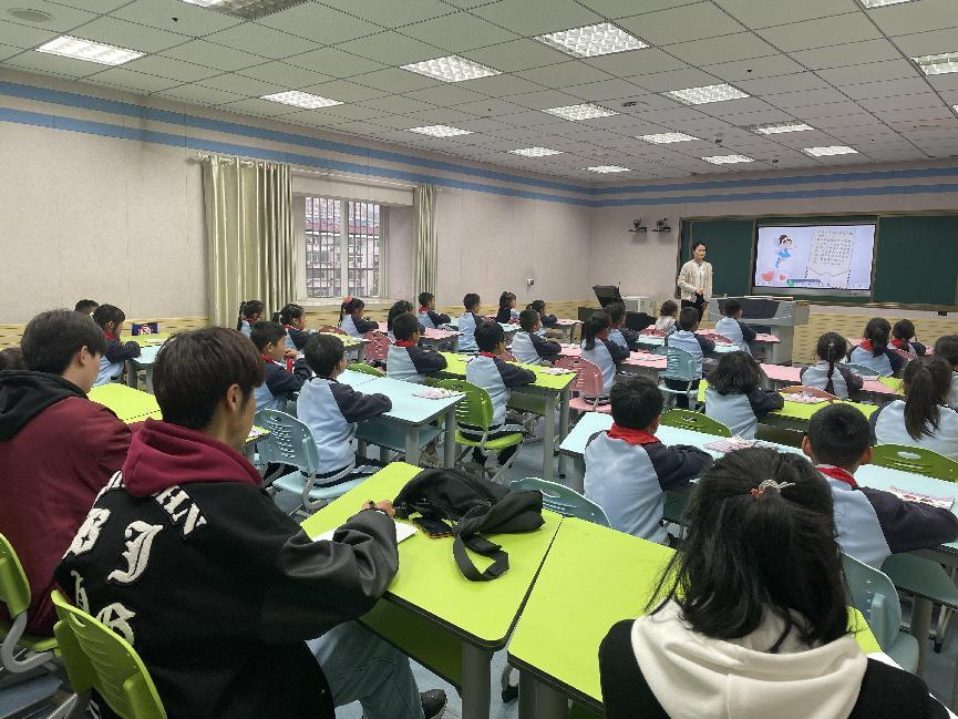 在第二个环节,观摩一节音乐课活动中,合肥芙蓉小学的二年级音乐老师何老师,给同学们上了一节音乐课。音乐课的课题是《音乐小屋》,何老师的导入环节十分有趣,采用了情境式教学方法,将同学们带入魔法森林,并进行一些有关于音乐的小闯关,很大程度地激起了同学们的学习兴趣。通过这节音乐课的观摩,同学们对课堂上理论知识的实际运用如:教唱法、小组交流、创编舞蹈等有了直观的体验。