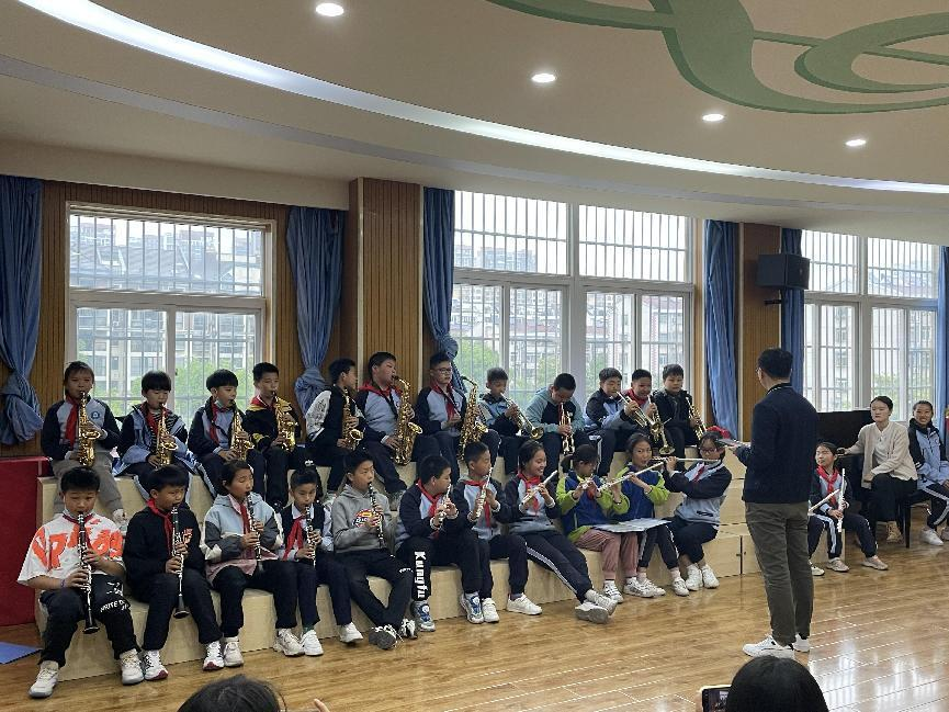 在第三环节观摩社团(第二课堂)活动中,同学们观摩了合肥芙蓉小学的管弦乐社团演奏。在社团老师的领导下,小学生们边整齐地踏步边演奏进行曲,观摩的同学深受感染。