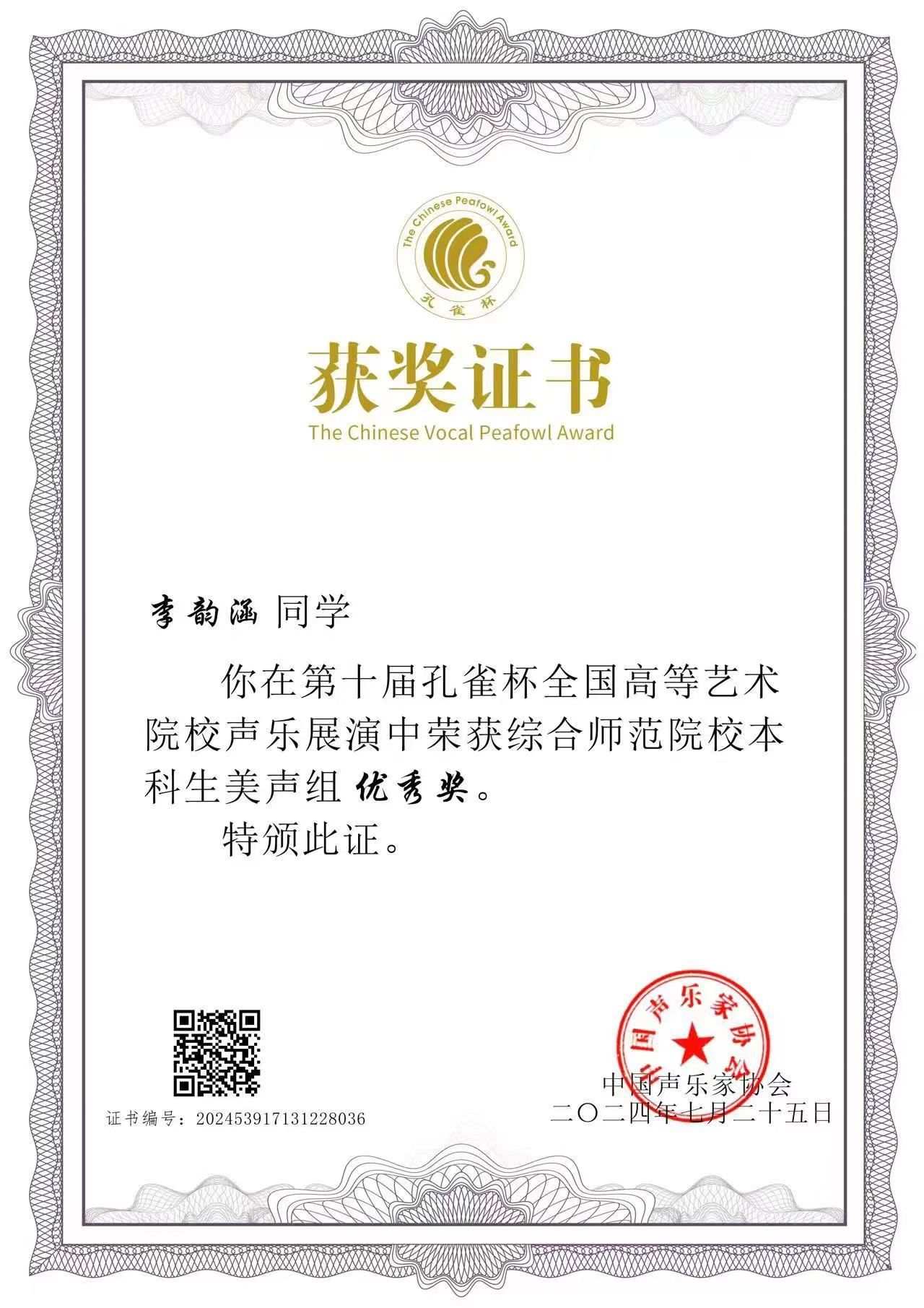 孔雀奖声乐比赛作为我国声乐领域的重要赛事,旨在挖掘和培养新一代声乐人才,推动我国声乐艺术的繁荣发展,是全国高校唯一常设的声乐综合性大奖,也是中国声乐权威赛事之一,具有重大的学术影响力和专业认可度。孔雀奖的荣誉,不仅是对李韵涵同学声乐才华的认可,更是永利23411集团教学成果的一次集中展现。此次大赛的参与,检验了永利23411集团声乐方向学生的培养质量,进一步坚定了永利23411集团的人才培养目标:“立足合肥、面向安徽、辐射长三角”,培养具有创新精神的优秀人才。(永利23411集团:谢梦珂)