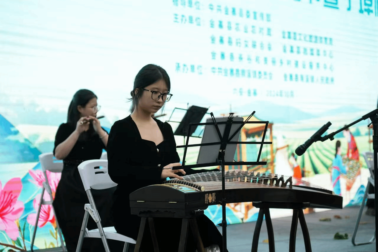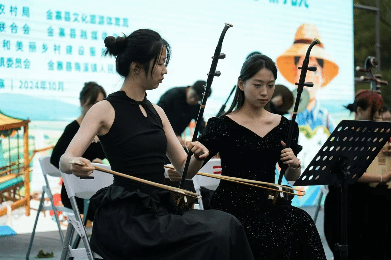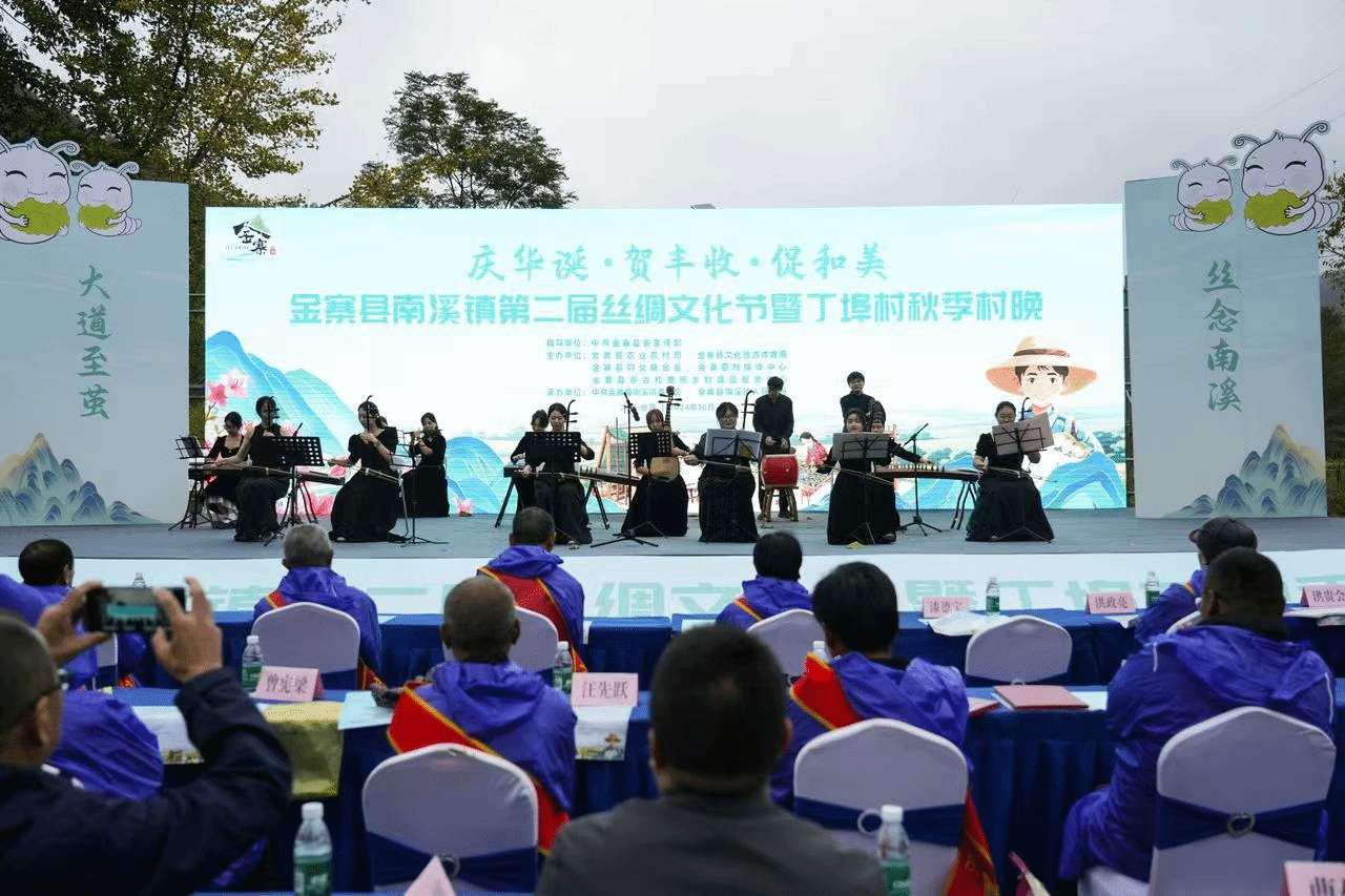 2024年10月19日,永利23411集团学生民乐团在yL23411永利集团驻金寨县文化特派员余志铭老师和驻南溪镇联络员江楠老师的带领下前往金寨县南溪镇,参加金寨县南溪镇第二届丝绸文化节暨丁埠村秋季村晚。在丝绸文化节暨村晚舞台,学生民乐团为村民表演了合奏节目《花好月圆》。同学们情绪饱满,技艺娴熟,既体现了永利23411集团学子的专业性,又赢得了台下村民的阵阵掌声。
